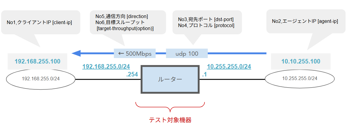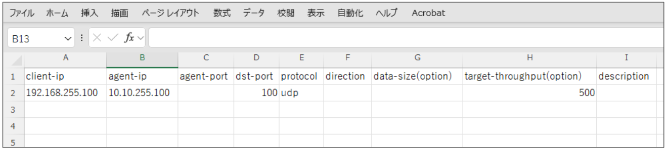 | No | 1,クライアントIP [client-ip] | 2,エージェントIP [agent-ip] | 3,宛先ポート [dst-port] | 4,プロトコル [protocol] | 5,通信方向 [direction] | 6. 目標スループット [target-throughput(option)] | 説明 |