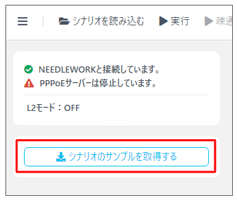ブラウザが起動し、NEEDLEWORK操作画面の「シナリオを読み込む」をクリックし、作成したテストシナリオ(CSV)を読み込みます。