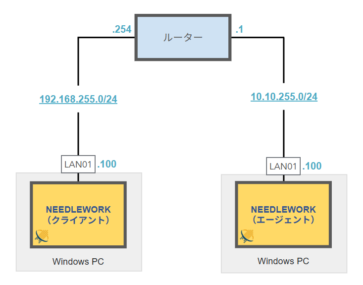 - テスト環境の構築 NEEDLEWORKとテスト対象のネットワーク機器をネットワークケーブルで接続します。 エージェント側PCでエージェントを起動します。