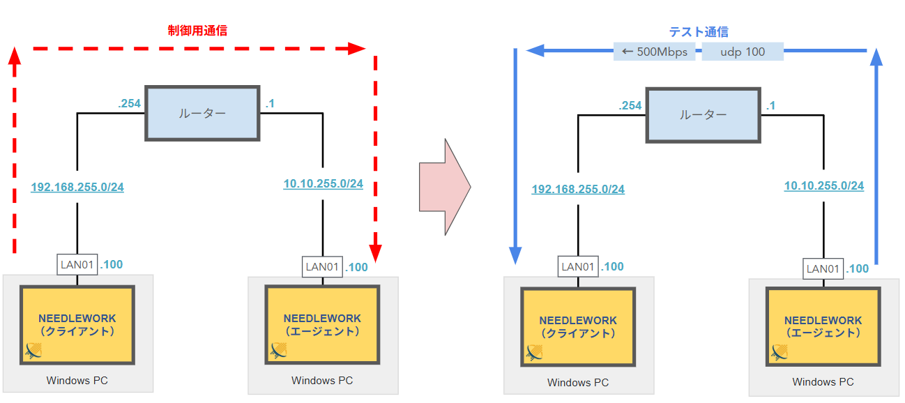 スループットテスト機能は1台のPCで送信元・宛先IPアドレスを生成しテストを実施します。