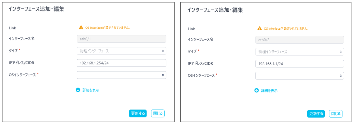 - OSインターフェースが指定されていないエラーが表示されるので、ネットワークケーブルで直結した2つOSインターフェースを指定します。
