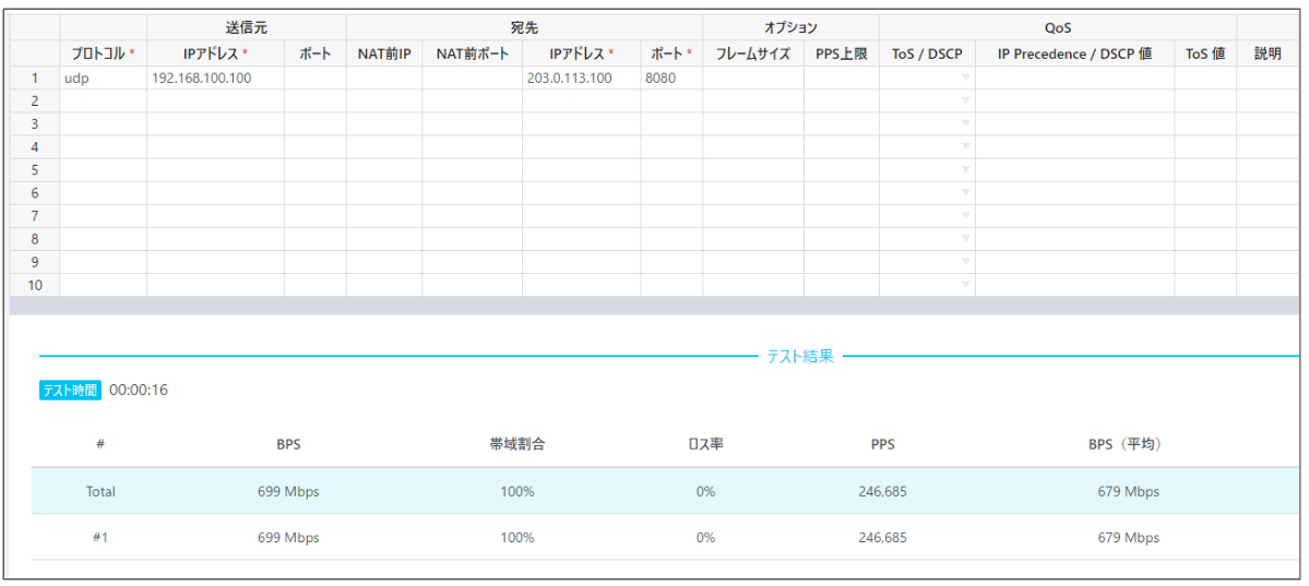 - テスト結果を確認します。 ※表示されるPPSおよびBPSが、実行しているPC・OSインターフェースでの性能となります