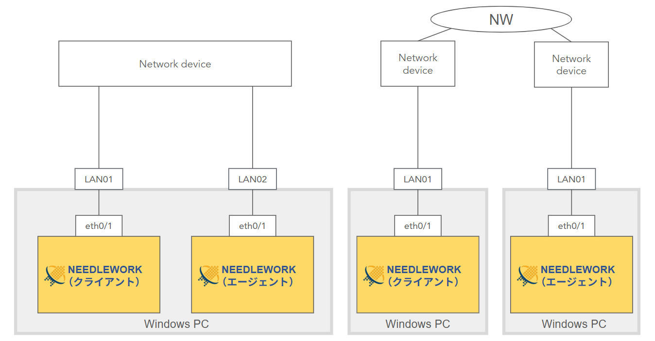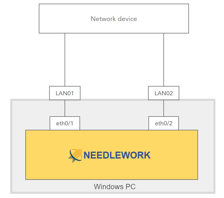 - テスト環境の構築 NEEDLEWORKとテスト対象のネットワーク機器をネットワークケーブルで接続します。 その他の検証機材は不要です。