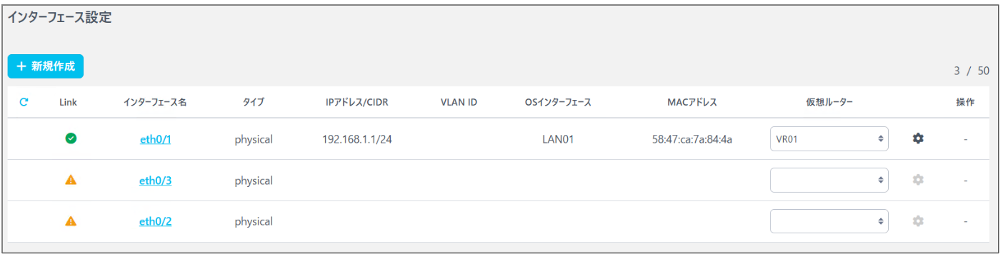 | eth0/1 | 物理インターフェース | 192.168.1.1/24 | - | LAN01 | - | VR01 |